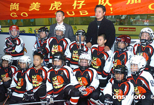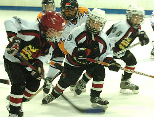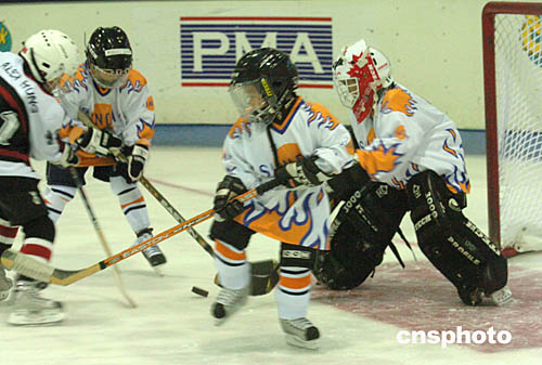 2004年亞太區少兒冰球賽25日在香港西九龍中心舉行﹐北京尚美虎仔隊(黑衣)以六比零戰勝香港隊。