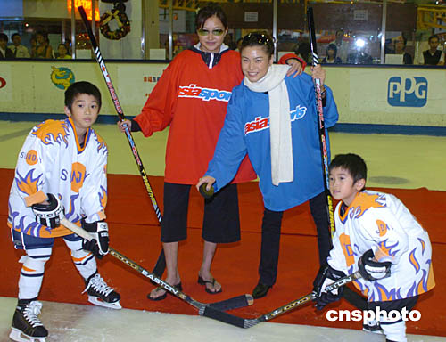 香港藝人李綺虹﹑廖碧兒25日在香港西九龍中心為2004年亞太區少兒冰球賽開球。