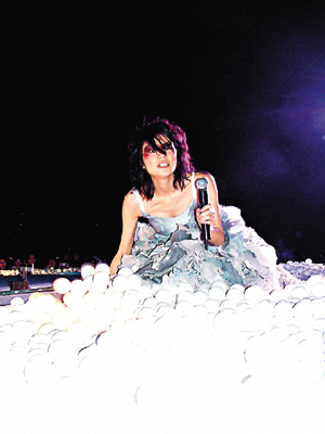 王菲的演唱會不會有變化多端的舞蹈或性感,但這晚她興之所至唱《精彩》時,赤腳跑到臺前的“波波池”玩,更把白色波波拋給觀眾,自己又因?yàn)檎静环(wěn)兩度跌在池中,還開心地大笑,有如一個小朋友般頑皮。同時臺上又出現(xiàn)了漫畫版的王菲,這段漫畫是代替了之前一段讀白,因?yàn)槊看尾ネ暝撈味甲屓苏`會她打算退出,故主辦單位決定換掉。熒幕上出現(xiàn)的漫畫版王菲,肥肥白白,因?yàn)椤鞍⒎啤币幌蚨伎释约嚎梢耘忠稽c(diǎn)。演唱會以《人間》一曲結(jié)束,雖然歌迷熱情地大叫安哥,但向來沒有安哥習(xí)慣的她,以超過五分鐘的時間向觀眾深深鞠躬,代表了她對歌迷的謝意。