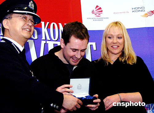 香港旅發(fā)局主席周梁淑怡與香港入境事務(wù)處機(jī)場(chǎng)管制科指揮官蔡普特,今天在機(jī)場(chǎng)舉行歡迎儀式,向芭芭拉頒發(fā)證書(shū),贈(zèng)送香港旅游發(fā)展局水晶帆船等紀(jì)念品,共祝香港旅游邁進(jìn)新旅程。