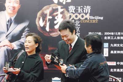 中新網(wǎng)12月9日電 據(jù)北京娛樂信報報道,明(10)天晚上,“款款深情——費(fèi)玉清2004北京演唱會”即將在工人體育館上演,費(fèi)玉清將現(xiàn)場演唱近50首懷舊金曲。從上世紀(jì)30年代的《夜來香》等直到80年代末的《船歌》,費(fèi)玉清演唱會可以說是對大半個世紀(jì)來國語流行曲的一次最全面的回顧。在年底一系列的演唱會中,這次個唱被認(rèn)為是一場“可以坐著聽的演唱會”,如果對照著國語流行音樂跌宕起伏的發(fā)展欣賞費(fèi)玉清的演唱,這場個唱確實也多了一層坐看潮起潮落的韻味。