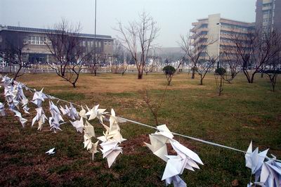 2萬只學生親手制作的紙鳶環繞在南開大學校園,寄托無限哀思。 (人民網圖;陳杰/攝 )