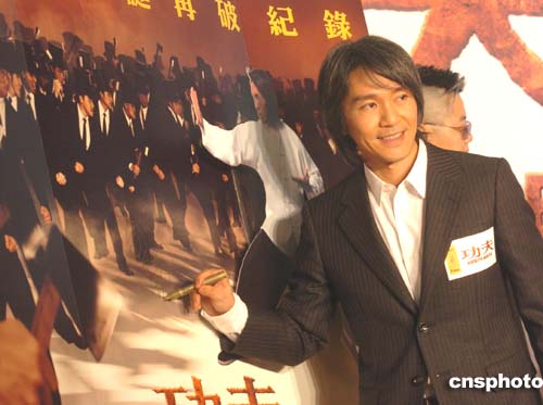 由周星馳自編﹑自導﹑自演耗時兩年多拍攝的影片《功夫》16日晚在香港時代廣場舉行首映開幕禮﹐在片中擔任主要角色的周星馳在“影片”《功夫》上簽名,該片將在12月23日在全球上映。作者:趙振清
