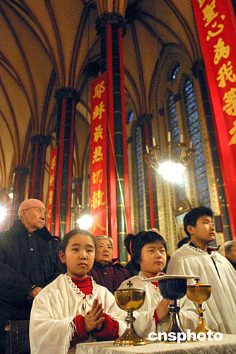北京西什庫天主教堂舉行盛大彌撒。圖為奉獻班的孩子在彌撒中。作者:張勤