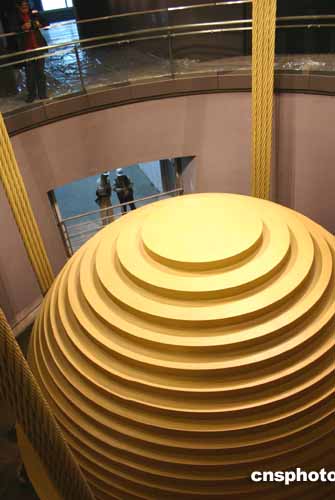 臺北101大樓八十九層觀景臺12月28日下午向媒體開放,樓內安裝的世界最大風阻尼器引人注目。該風阻尼器球體直徑五點五米,重達六百六十公噸,從大樓九十二層懸掛到八十八層,對因地震、強風造成的水平偏移能產生百分之四十以上的反作用,是世界最大也是唯一外露的風阻尼器。作者:黃少華