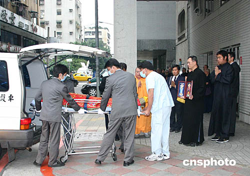1月3日下午,辜振甫的遺體被移回家中,其子辜成允手執(zhí)佛像在家門口引導(dǎo)。