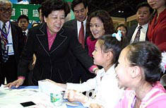 圖:國務委員陳至立科技周上與小朋友親切交談