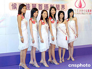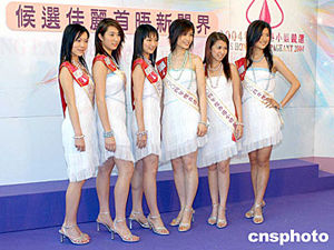 《2004年度香港小姐競選》5月18日在香港舉行記者會,十八位候選佳麗首度會晤傳媒。圖為1---6號候選佳麗:朱慧敏、余妍慧、毛嘉欣、鄧慧琦、楊施詩、徐子珊(左起)。作者:鄧慶樂