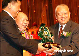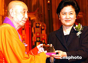 國(guó)家宗教局局長(zhǎng)葉小文、中國(guó)佛教協(xié)會(huì)會(huì)長(zhǎng)一誠(chéng)法師,五月二十六日在香港會(huì)展中心舉行的香港佛教暨各界迎請(qǐng)佛指舍利瞻禮祈福大會(huì)儀式上,向香港特首董建華贈(zèng)送紀(jì)念品。 作者:錢(qián)興強(qiáng)
