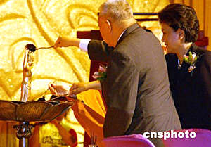 全國(guó)政協(xié)副主席、中共中央統(tǒng)戰(zhàn)部部長(zhǎng)劉延?xùn)|、香港特首董建華等,五月二十六日出席香港佛教暨各界迎請(qǐng)佛指舍利瞻禮祈福大會(huì)浴佛典禮。 作者:錢(qián)興強(qiáng)