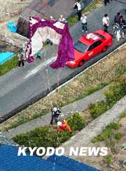 救護隊員將懸掛于高壓線下的女性救下(共同社)