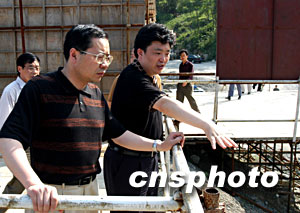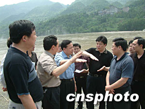 從北京和武漢趕回的中共恩施州委書記湯濤(左)、州長(zhǎng)周先旺(右)在大龍?zhí)峨娬敬髩维F(xiàn)場(chǎng)。文林?jǐn)z