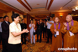 全國政協副主席、中央統戰部部長劉延東,5月28日在下榻酒店會見一誠法師等佛指舍利赴港護送團成員。作者:洪少葵