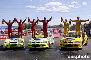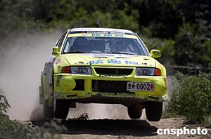 2004年全國汽車拉力錦標賽“海淀駕校杯”北京拉力賽經過2天激烈的較量5月30日在北京落下帷幕,由于鳳凰嶺惡劣的路況,參賽的68部賽車今天共有49部賽車參加比賽。N組冠軍被咳速停拉力車隊11號車(中)的英國外援大衛·辛吉斯/丹尼爾·巴里特獲得,亞軍是佳通輪胎車隊(右)的劉曹東/周麗,咳速停拉力車隊的劉斌/黃煜獲得第三名。中新社記者:盛佳鵬
