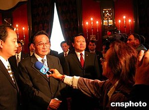 當(dāng)?shù)貢r(shí)間五月三十日,即將結(jié)束對(duì)保加利亞友好訪問的中國(guó)全國(guó)人大常委會(huì)委員長(zhǎng)吳邦國(guó)在索非亞接受媒體記者的采訪。中新社記者:戴亞平
