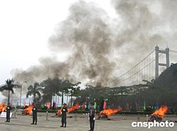 六月三日,廣東有關部門在虎門現場銷毀了一百六十五公斤毒品,以紀念民族英雄林則徐虎門硝煙一百六十五周年。廣東虎門現在是全國禁毒教育基地。作者:楊伏山