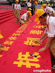 適逢民族英雄林則徐虎門硝煙一百六十五周年,福建省和廣東省禁毒辦聯袂在虎門主辦閩粵港澳臺青少年禁毒夏令營活動。圖為閩粵港澳臺青少年學生集體簽名,對毒品說“不”。作者:楊伏山