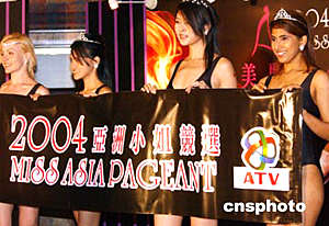 2004亞洲小姐競選發布會六月八日在香港舉行,圖為模特在發布會上展示標語。