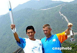 六月八日,奧運火炬來到慕田峪長城,中國足球運動員楊晨、雅典圣火傳遞團團員共同展示火炬和載有圣火火種的“馬燈”。中新社記者:鄭萍萍