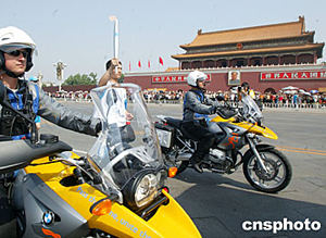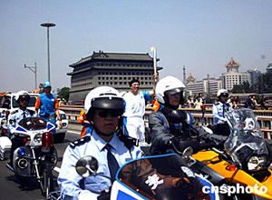 六月九日,二○○四年雅典奧運火炬北京接力從人民大會堂東門外廣場起程,將經過一百四十八名火炬手傳遞五十五公里到達終點頤和園。圖武警國旗護衛隊戰士阮野在雅典奧運火炬護衛騎警的護衛下跑過天安門。中新社記者:鄭萍萍