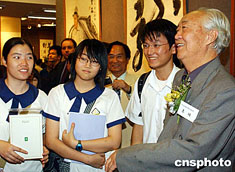 “邵華澤、李琦、馮真書畫展”六月十四日在香港大會堂開幕,是次書畫聯展共展出作品九十逾幅,圖為李琦在展會上向參觀學生介紹繪畫作品。中新社記者:錢興強