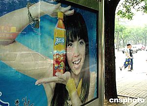 周日的北京街頭,由臺灣藝人張惠妹擔任形象代言人的某品牌飲料廣告牌依然醒目。中新社記者:賈國榮