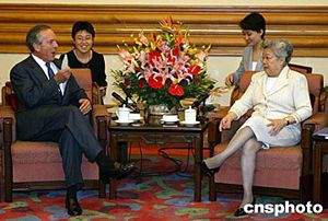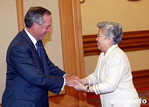中國國務院副總理吳儀六月二十三日在北京中南海會見來訪的美國商務部長埃文斯。會談中,吳儀副總理指著自己穿的衣服和鞋子說,這些都是美國產(chǎn)品,也算是為縮小中美貿(mào)易逆差做貢獻,幽默的語言引來現(xiàn)場一片歡笑。中新社記者:毛建軍