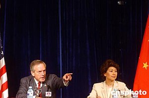 六月二十四日,美國商務部長埃文斯和勞工部長趙小蘭在北京舉行聯合記者會,就中美貿易等有關問題答記者問。中新社記者:武仲林