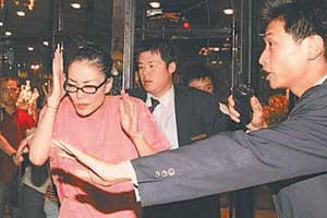 王菲和其助理、孫楠、李亞鵬乘林肯車回酒店,計(jì)劃由孫楠充當(dāng)攝影記者的擋箭牌,分散注意力,保護(hù)二位順利上樓。可是意料之外的是,在酒店門外,十多位王菲的歌迷,苦等了一夜,依舊站在那里不停地呼喊,氣勢(shì)不減;還有,記者的兩臺(tái)車始終分隔在林肯轎車的前后,原本要躲避影迷從酒店員工通道進(jìn)入的林肯轎車不得不兜了一大圈后,停靠在酒店正門。歌迷瘋狂到了極點(diǎn),孫楠根本無法引開火力,緊要關(guān)頭,一向低調(diào)的王菲親自掩護(hù)起李亞鵬來。