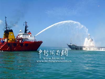 此時,觀摩演習的人們發(fā)現(xiàn),在出事船只周圍,已經有多條各類救助船開始行動,中國救助船“南鷹”輪和“南海救一六八”輪一左一右向燃燒著的遇難船只進行壓制性滅火。兩只泡沫槍和一只高壓水槍對準海難船強制滅火。此時的場面蔚為壯觀,一只高壓水槍激起的水霧在熱帶陽光的照耀下出現(xiàn)了一道漂亮的彩虹。