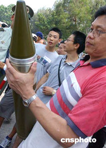 為慶祝香港回歸祖國七周年,中國人民解放軍駐香港部隊于七月一日舉行三軍軍營開放活動,在赤柱軍營參觀者對各種武器展示充滿興趣。作者:錢興強