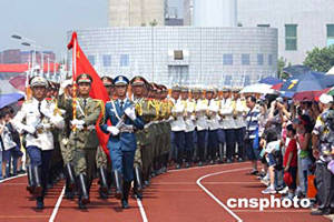 中國人民解放軍駐港部隊儀仗隊7月1日上午在昂船洲海軍軍營舉行表演,受到數千市民的夾道歡迎。中新社記者:趙振清