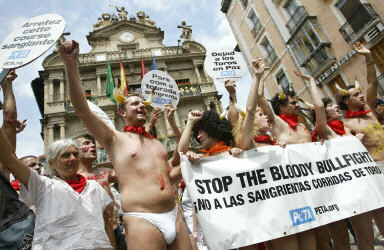 7月5日,在西班牙潘普洛納市,許多抗議者赤裸著身體走上街頭聲討每年舉行的奔牛節,他們稱這是非常血腥殘忍的活動。