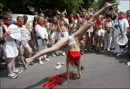 呼吁停止虐待公牛的西班牙女示威者做出體操動作