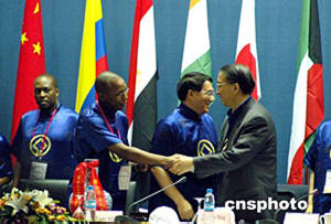 為期十天的第二十八屆世界遺產(chǎn)委員會會議七月七日在蘇州順利閉幕。閉幕式上通過了下屆世遺大會主席的選舉議程,南非的丹巴·瓦卡什當(dāng)選第29屆世界遺產(chǎn)委員會會議的主席。圖為章新勝與丹巴·瓦卡什握手(左)。作者:蔣振江