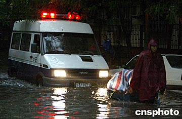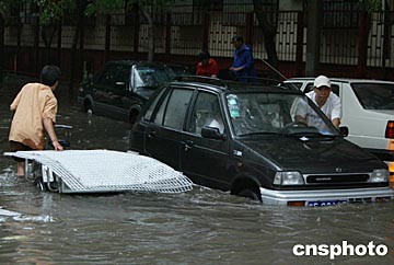 中新網7月10日電(記者 聞育旻) 10日下午4時許,北京上空電閃雷鳴,突遭瓢潑大雨,北京城區部分街道水深及膝蓋,部分車輛因發動機進水而癱瘓于路中,城區交通嚴重擁堵。