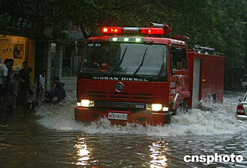 北京遭遇罕見暴雨侵襲,不少地區成災,消防隊緊急出動排澇救災。中新社記者:任晨鳴