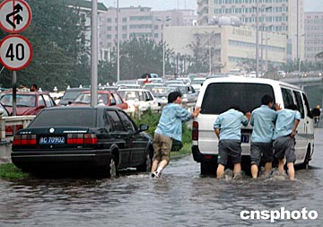 10日下午4時許,北京上空電閃雷鳴,突遭瓢潑大雨,北京城區部分街道水深及膝蓋,部分車輛因發動機進水而癱瘓于路中,城區交通嚴重擁堵。