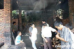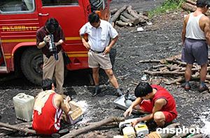 十四日七時(shí),湖南湘潭雙扶煤礦系統(tǒng)進(jìn)行提升時(shí),因電纜折斷,造成電纜短路起火,導(dǎo)致井筒木支架起火燃燒,使當(dāng)時(shí)正在井下作業(yè)的九十五人被困。現(xiàn)已確認(rèn)有六人死亡,還有三人被困井下,下落不明。圖為發(fā)生礦難的井口。作者:白祖偕