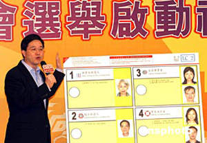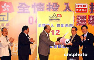 2004年香港立法會(huì)選舉開(kāi)幕典禮17日在文化中心大堂舉行﹐政制事務(wù)局局長(zhǎng)林瑞麟介紹選票。