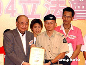 2004年香港立法會(huì)選舉開(kāi)幕典禮17日在文化中心大堂舉行﹐選舉管理委員會(huì)主席胡國(guó)興大法官向選舉大使頒發(fā)證書。