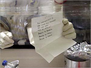 2001年發生的炭菌襲擊共造成5人死亡、17人受傷。911襲擊一個月后,沾有炭菌粉末的郵件被投寄到政府辦公室、新聞機構、紐約郵局和多名參議員,造成多家機構關閉,老百姓人心動蕩。目前還沒有一人因炭菌襲擊被起訴。