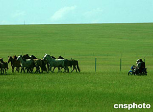 七月的內蒙古呼倫貝爾大草原上,年青的牧民騎著摩托車放牧馬群。中新社記者:賈國榮