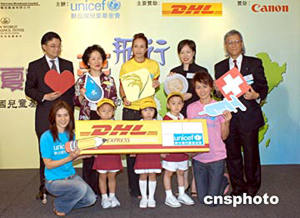 聯合國兒童基金會“教育大使”楊采妮7月22日在香港出席聯合國兒童基金會舉行之《寧夏童心夢飛行》記者會,楊采妮與梁詠琪、莫文蔚將攜手于八月前往內地寧夏地區親善探訪當地兒童。聯合國兒童基金會香港委員會主席馮慶彪(右一)、副主席陳方安生(左二)與三位大使聯同贊助商舉行儀式,并呼吁各界踴躍捐款。作者:鄧慶樂