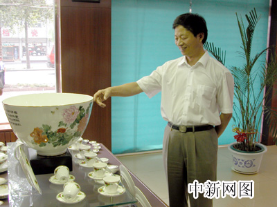 河北省委宣傳部副部長相金科參觀骨質(zhì)瓷展示廳,對其中一只骨質(zhì)瓷大碗頗感興趣。(秦欣攝)