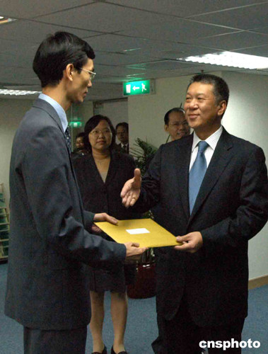 競選連任的澳門特別行政區行政長官何厚鏵(右)到選舉協調中心交回參選提名表