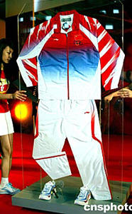 七月二十七日,李寧公司贊助第二十八屆奧運(yùn)會(huì)中國(guó)代表團(tuán)新聞發(fā)布會(huì)在北京舉行,李寧公司正式推出以“錦繡中華”領(lǐng)獎(jiǎng)服和“極光”領(lǐng)獎(jiǎng)鞋為主的領(lǐng)獎(jiǎng)裝備。中新社記者:鄭萍萍