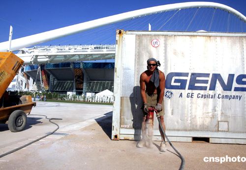 (當地時間)二○○四年八月二日上午,一名鉆工在希臘雅典奧運會主會場外冒著烈日安裝配套設施,雅典奧運會主會場建設工程已經收尾。中新社記者:任晨鳴