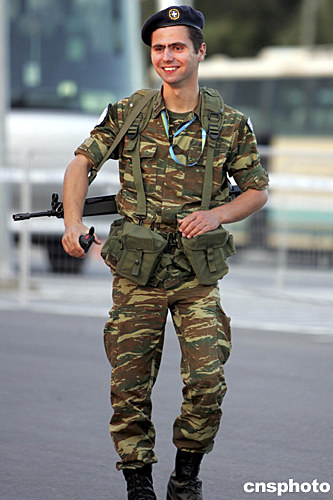 當地時間8月2日傍晚,一名肩挎微型沖鋒槍的希臘軍警執勤后輕松地下崗返回軍營。奧運會期間,雅典奧運會所有場地除了警方嚴加守衛外,都有配備沖鋒槍的軍警執勤,防范恐怖襲擊。中新社記者:任晨鳴