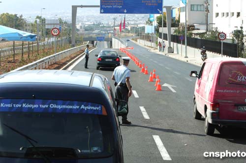 (當地時間)二○○四年八月三日,位于希臘雅典市郊的奧運村入口由警方嚴加把守。中新社記者:任晨鳴